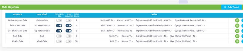 Örneğin, 101 ve 102 numaralı odalar "Tek Yataklı Oda" olarak gruplandırılmıştır ve entegrasyon kodu olarak 1 belirlenmiştir. 102 ve 105 numaralı odalar ise "İki Yataklı Oda" olarak gruplandırılmış ve entegrasyon kodu olarak 2 verilmiştir. Web sitesinin yönetim panelinden odalar eklerken, "Tek Yataklı Oda" için 1 entegrasyon kodunu, "İki Yataklı Oda" için ise 2 entegrasyon kodunu atarız.